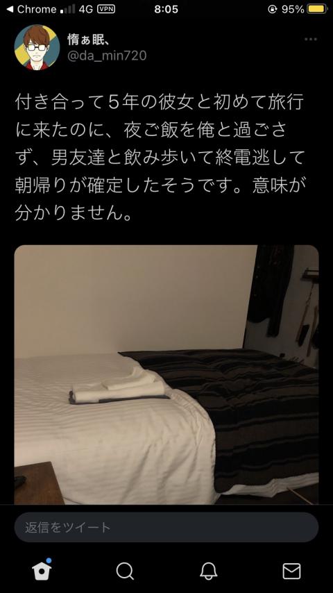 ツインの部屋写すだけで彼女との旅行と証明出来るわけないやろアホやこいつ